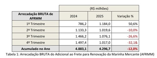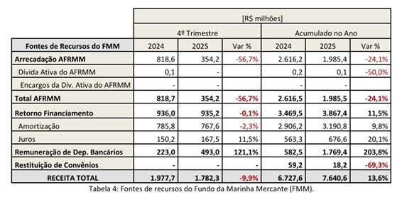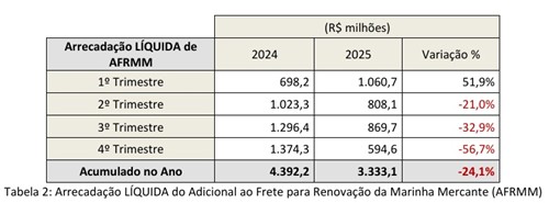 Os valores líquidos arrecadados do AFRMM em 2025 foram de aproximadamente R$ 3,3 bilhões, 24% a menos, na comparação com a arrecadação do ano anterior (R$ 4,4 bilhões). No 4º trimestre, esse item alcançou redução de 57% (R$ 595 milhões), ante R$ 1,4 bilhão de arrecadação líquida no último trimestre de 2024. A arrecadação líquida de AFRMM é resultado dos valores de retificações e compensações da arrecadação bruta, conforme a Lei 10.893/2004.