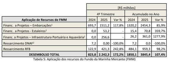 O relatório traz ainda que, no ano passado, foram aplicados R$ 3,8 bilhões de recursos do FMM, 107% acima dos quase R$ 1,9 bilhão de desembolsos de 2024. No 4º trimestre de 2025 foram aplicados R$ 2,2 bilhões de recursos do FMM, 172% a mais que os R$ 824 milhões de desembolsos totais no mesmo período do ano anterior. Em 2025, R$ 2,5 bilhões foram repassados para financiamento de projetos de embarcações, 86% a mais que no ano anterior (R$ 1,3 bilhão).